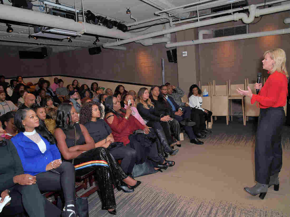 Journalist Gretchen Carlson addresses the crowd before the planned screening of Surviving R. Kelly in New York on Dec. 4, 2018. The room was evacuated after a gun threat was called in. Chance Yeh/Getty Images for A&E hide caption