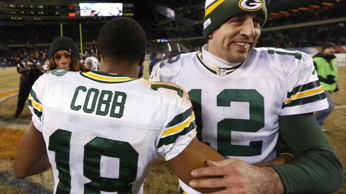 Aaron Rodgers celebrates with wide receiver Randall Cobb after the Packers' 33-28 victory against the Bears on Dec. 29, 2013, at Soldier Field. Cobb scored on a 48-yard reception with 38 seconds left.