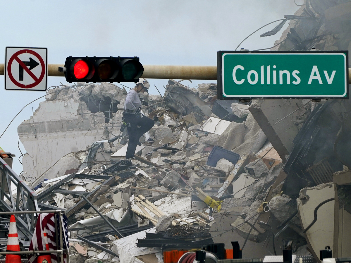 A rescue worker walks among the rubble where a wing of a 12-story beachfront condo building collapsed on Thursday in Surfside, Fla.